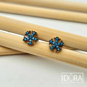 Малки небесносини тюркоази подредени в елегантна форма на снежинка в контраст между наситеното синьо, тъмни обрамчвания и плътна позлата, придаващи дълбочина и характер с деликатен блясък, носещ усещане за нежност и финес. Създадени за обичащите детайла и красотата в малките неща - едно бижу на изкуството и стила. Размер: диаметър 7,0 мм.