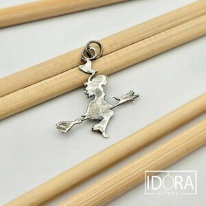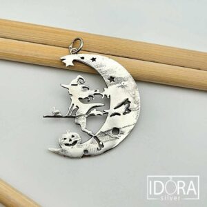 Медальон уловил вълшебната магия на нощта и мистичната изящност на суеверията. В полумесец, обсипан със звезди, се е настанила вещица със закачлива шапка, устремена напред на своята метла. До нея сияе усмихнат фенер тиква – символ на Хелоуин и скритите тайни на тъмнината. А, къде е котката?