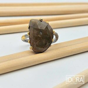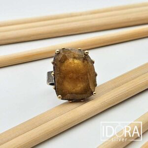 Масивен изящен пръстен, в който се срещат сила, контраст и хармония. Асиметрично разположени КИАНИТИ – единият дълбок като нощно небе в тъмносиня гама, другият, топъл, меднокафяв и загадъчен като залез. Камъните са обгърнати от позлатени обкови, които придават благороден блясък и подчертават естествената им красота. Контрастът между родираното сребро, топлата позлата и живите цветове на камъните създават усещане за баланс между елементите – земя, въздух, огън и вода. Една малка скулптура, която носи духа на индивидуалност и изтънчен артистичен почерк – съвършен акцент, носещ история и символика в своя стил.