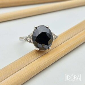 Майсторски изработена, царствено повдигната корона с фина орнаментика, нежно прегръщаща внушителния централен камък – дълбок, черен ОБСИДИАН с мистериозен блясък, който поглъща светлината и я връща с едва доловими отблясъци. Контрастът между ледения блясък на среброто и загадъчната дълбочина на камъка създава усещане за благородство и тайнственост.