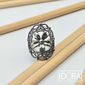 Миниатюрен скулптурен свят със стилизирано цвете рамкирано с орнаменти, вплетени в изящни филигранни извивки, напомнящи тайна градина, съхранена в широка деликатна композиция.