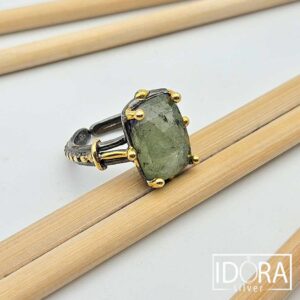 Прелестно фасетиран ПРЕНИТ в дълбок зелен цвят и включения, напомнящи следи от древна история. Естествен, непринудено прегърнат от масивна основа с черно родиево покритие и акценти в позлата, носещи усещане за симбиоза между древност и изисканост.