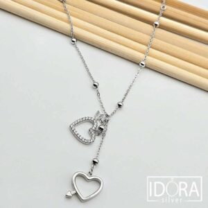 ( 0 )Колие, запазило миг на нежност, превърнат в блясък. Две сърца – едното обсипано с деликатни камъни, другото изваяно в чист контур се спускат като две тихо преплетени истории. Стрелите, които ги пронизват, подсказват за любов, която едновременно ранява и озарява. Верижката, нежна и ефирна, е украсена с малки сребърни сферички, проблясващи като капки светлина по струни, носещи усещане за романтика. Родиево покритие.