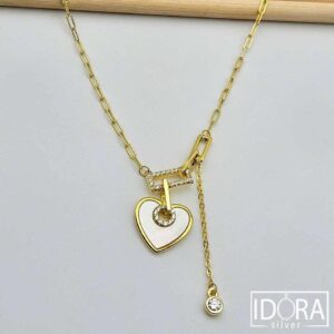 ( 0 )Елегантна верижка в позлата и фина оплетка среща съвременната геометрия и романтиката. Сърце от бял седеф с център обрамчен от циркони допълва топлината с усещане за мекота и чиста емоция. Асиметричната композиция от халки, форми и камъни демонстрира силен характер и модерна елегантност, а фината висяща верижка с блестящ акцент завършва дизайна с нотка на лекота в потрепващо движение.