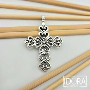 Сребърен кръст, изработен в изразителен дизайн с елегантни извивки и фино оформени детайли, напомнящи бароков стил. Богатата орнаментика придава дълбочина и впечатляващ визуален ефект, превръщайки символа на вярата в силно естетично и духовно присъствие.