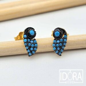 Прецизно изработени извита пера, символизиращи движение и елегантност. ТЮРКОАЗени камъчета в наситено синьо като преливаща каскада, носеща дълбочина на композицията около централния камък, обрамчен от изящен ореол от черно родиево покритие, създаващо усещане за античност и мистичност.