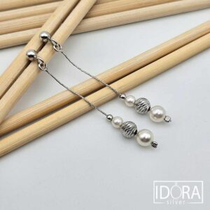 32,00 лв. / 16,36 €Изящни обеци от сребро и перли, артистично подредени върху фини сребърни верижки – преплитането на класически перли с елегантно гравирани сребърни сфери, създава усещане за синхрон в традиция и модерна естетика.