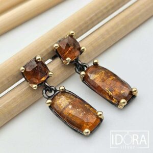 149,00 лв. / 76,18 €Фасетиран КАФЯВ КИАНИТ в цялата си екзотична топлина и привкус на кехлибарено-кафяви оттенъци в силно усещане за огън, земя и древна тайна. Светлината танцува по повърхността на камъните като неугасващ пламък. Покритието от черен родий, подсилено със златисти акценти, създава осезаемо драматичен контраст и добавя благородна сила към подчертаното излъчването на женственост.