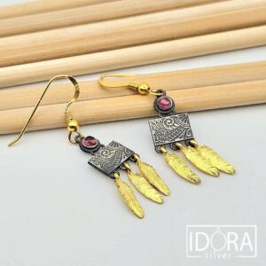 Изящни, авторски обеци в съвършен танц между древна символика и съвременна елегантност в сребро и съчетание между фина гравюра и етно изкуство - дизайн пречупен през призмата на история и модернизъм - позлатените пера, подвижни при всяко движение, създават усещане за свобода и въздушност, подчертана от малкия ТУРМАЛИН в деликатен акцент, придаващ нежна топлина и страст.