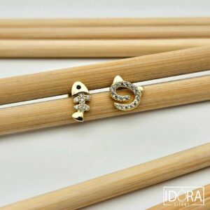 ( 0 )Две малки стилизирани форми – рибка и котка в закачлива комбинация на обеци с минималистичен дизайн с малки, проблясващи дискретно камъчета, излъчващи тиха елегантност и лекота, подчертана от топлия нюанс на позлатата.