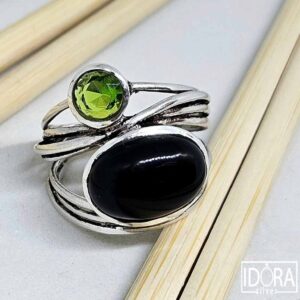 99,00 лв. / 50,62 €ЧЕРЕН ОНИКС кабошон и чудесно контрастиращ в зелено фасетиран ПЕРИДОТ - камъни обвити от застинали в движение сребърни лиани, прилежно обгръщащи пръста. Модерен дизайн и смело съчетание на цветове и форми.