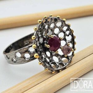 129,00 лв. / 65,96 €Пръстен с филигранна структура от отвори, наподобяваща артистична и фина абстрактна дантела с асиметричен акцент от инкрустиран фасетиран РУБИН и розов ТУРМАЛИН, обградени от орбита малки златисти топчета, украсили периферията и създаващи визуален контраст в елегантен завършек на цялостната композиция.
