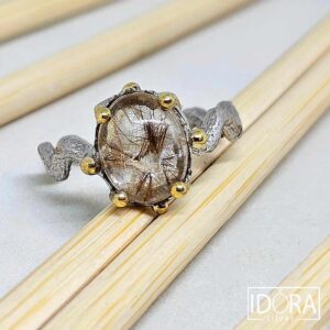 99,00 лв. / 50,62 €РУТИЛОВ КВАРЦ (Косите на Венера)в центъра на корона с елементи на позлата, родиево покритие и динамично оформена халка. Грация и разкош в сребърна еуфория.