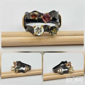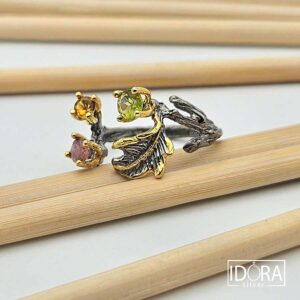 Богатство от цвят на естествени камъни, сребърни неувяхващи цветя, черен родий и позлата с нюансиран ефект в детайлен флорален дизайн и ръчна израбока. СУЛТАНИТ, ЛУНЕН КАМЪК, РУБИН, ТУРМАЛИНИ, СИН САПФИР, СИН ТОПАЗ И ПЕРИДОТ.