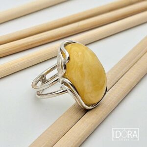 159,00 лв. / 81,30 €ЯЙЧЕН КЕХЛИБАР във впечатляваща скулптура - топлият жълт цвят с млечни облаци във вътрешността си, напомня на залез уловен и запечатан във вечност. Сребърната рамка от лиани, прегръща кехлибара, позволявайки му да диша и да излъчва собствената си светлина. Пръстенът носи усещане за естественост, свобода и леко бохемска елегантност.