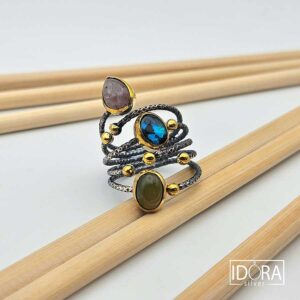 Релефни лиани се увиват около пръста като нежна, но уверена спирала, чиято текстура напомня ръчно изкована нишка. Позлатени акценти като капчици роса са разпръснати и срещащи се с усещане за топлина и благородство. В центъра на вниманието са три камъка в различни форми, душа и цвят.