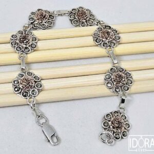 99,00 лв. / 50,62 €Сребърна гривна от седем прецизно оформени елемента, всеки обсипан с блестящи марказити, които придават изискан ретро чар. В центъра се разгръща обемно позлатено цвете – сияен акцент, който съчетава романтика и величие.