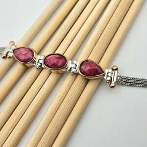129,00 лв. / 65,96 €Фасетирани РУБИНИ в изящно произведение на бижутерското изкуство, преплело сила и елегантност - формата сълза на страничните камъни придава на гривната деликатна емоционалност, докато централният овален камък внася стабилност и баланс. Комбинацията от топли и студени цветове съчетани в дизайна, символизира хармонията между противоположностите като страст и разсъдък, огън и лед.