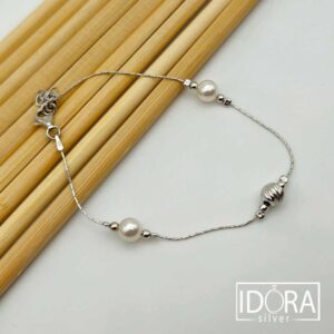 32,00 лв. / 16,36 €Изящна гривна от сребро и перли, артистично подредени върху фини сребърни верижки – преплитането на класически перли с елегантно гравирани сребърни сфери, създава усещане за синхрон в традиция и модерна естетика.