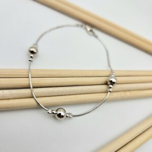 Изискана гривна, деликатно изработена от фино сребро с гладки, елегантни линии с родирана повърхност. Основният акцент са малки сребърни сфери, равномерно разпределени по дължината на верижката, добавяйки усещане за баланс и хармония. Гривната излъчва елегантност, лекота и съвременен минимализъм.