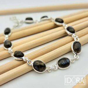 Едно истинско бижу за сетивата в нежно съчетание на изискан дизайн и естествената красота на ЛУННИЯ КАМЪК. Фините сребърни звена преливат плавно едно в друго, сливайки поредица от овални камъни с мек, опалесцентен блясък в загадъчна игра на светлина – от млечнобяла нежност до едва доловими нюанси на синьо. Закопчалка е регулируема, което добавя функционалност към красотата, позволявайки идеално прилягане върху всяка китка.