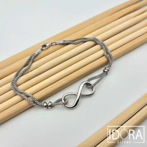 Символът на безкрайността оживява в гривна от италианско сребро – вечният знак на любовта, вярността и хармонията. Двойни фино изплетени верижки гъвкаво се преплитат, оставяйки усещане за безвремие, чистота, елегантност и неподвластна на времето красота.