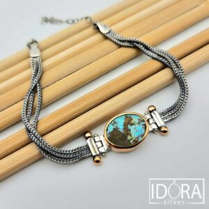 ( 0 )Гривна с усещане за тиха, земна поезия, носеща малък фрагмент от древен пейзаж, запечатан в сребро и камък. Централният елемент, овал от естествен ТЮРКОАЗ с впечатляващи кафяви жилки, напомня карта на мистичен свят - синевата на дълбоки езера, прорязана от линии като пътеки, водещи към неизвестното. В допълнение, деликатни триредови нишки се преплитат в изящен ритъм, разказващ история изтъкана с майсторство и време.