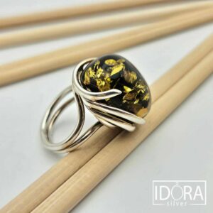 ЗЕЛЕН КЕХЛИБАР и изкуство срещнати в съвършена хармония. Осеян със златисти включения, напомнящи на капчици слънчева светлина застинали във времето, с усещане за движение и живот, бушуващ в миниатюрна вселена - кехлибарът е елегантно обгърнат от фино изваян сребърен обков, танцуващ около него като вълна.