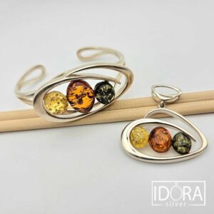 Трицвет от БАЛТИЙСКИ КЕХЛИБАР като основен акцент в масивна отворена гривна и арт медальон.