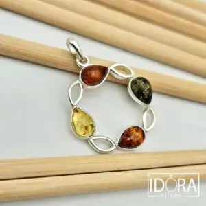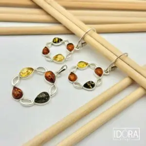 Изящнен медальон от сребро и КЕХЛИБАР с усещане за хармония между природа и изкуство. Меките линии на среброто обгръщат три сияйни камъка - слънчево жълто, топло медено и дълбоко зелено, уловили лъчите на изгрева, жарта на пладнето и мистиката на здрача. Три цвята, три момента от деня, три отражения на светлината, събрани в една символика – хармония между минало, настояще и бъдеще.