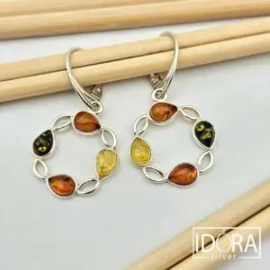 409,00 лв. / 209,12 €Изящно съчетание от сребро и КЕХЛИБАР с усещане за хармония между природа и изкуство. Меките линии на среброто обгръщат три сияйни камъка - слънчево жълто, топло медено и дълбоко зелено, уловили лъчите на изгрева, жарта на пладнето и мистиката на здрача. Три цвята, три момента от деня, три отражения на светлината, събрани в една символика – хармония между минало, настояще и бъдеще.