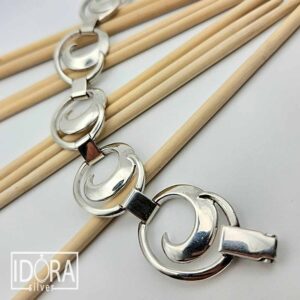 Изящна сребърна гривна, с оплетка от сложни възли, символ на свързаност, сила, стил и елегантност. Лъскавата повърхност на среброто улавя светлината по начин, който подчертава прецизната изработка и вниманието към детайла.