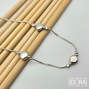 Сребърно колие, носещо духа на италианския минимализъм – стил, в който простотата се превръща в елегантност. Верижката е прецизно изработена, с плавна и изчистена линия, която нежно подчертава силуета. Акцентите от дисковидни елементи добавят усещане за ритъм и хармония, създавайки фин баланс между съвременна естетика и класическа сдържаност. Размер: дължина колие 42,5 см.