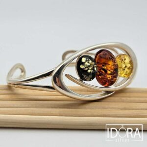 Изящна гривна от сребро и КЕХЛИБАР с усещане за хармония между природа и изкуство. Меките линии на среброто обгръщат три сияйни камъка - слънчево жълто, топло медено и дълбоко зелено, уловили лъчите на изгрева, жарта на пладнето и мистиката на здрача. Три цвята, три момента от деня, три отражения на светлината, събрани в една символика – хармония между минало, настояще и бъдеще. Размер: гривна регулируема, в момента с вътрешен диаметър 60,0 мм.