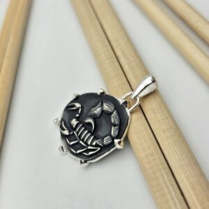 Медальон с вградената мощна символика на скорпиона - изработка с внимание към детайла, подчертаваща всяка извивка и сегмент на фигурата, демонстрираща ефекта от контраста и силата на тъмния фон с яркия блясък на среброто. Заключен в основа с неправилна форма, медальонът е като древен амулет с мистичен знак, носещ със себе си сила, интуиция и трансформация.