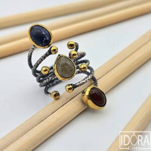 89,00 лв. / 45,50 €ЛАПИС ЛАЗУЛИ, капка РУТИЛОВ КВАРЦ и магичен ТУРМАЛИН в подреден хаос в корона от стилизирани сребърни лиани, плътно и широко обгръщащи пръста. Елементно покритие в чаровна добавка на модерния дизайн.