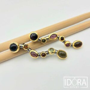 ( 0 )Двете обеци сякаш са родени от движението на природата – органични, нестандартни, изпълнени с цвят и живот, наподобяващи извити клонки, по които множество цветни ТУРМАЛИНИ са разцъфнали като мистични плодове на светлината. Позлатени обкови очертават всеки камък като миниатюрен слънчев ореол, а тъмната основа добавя усещане за дълбочина и древност.