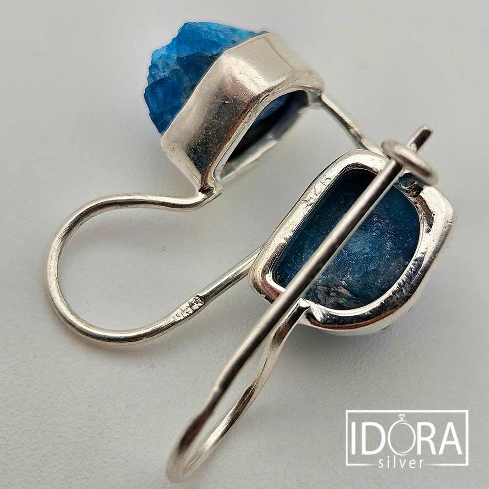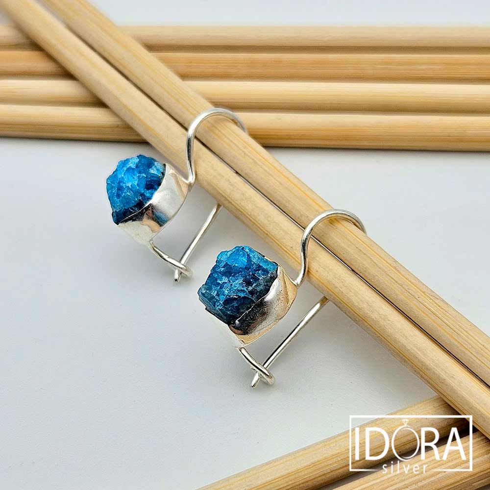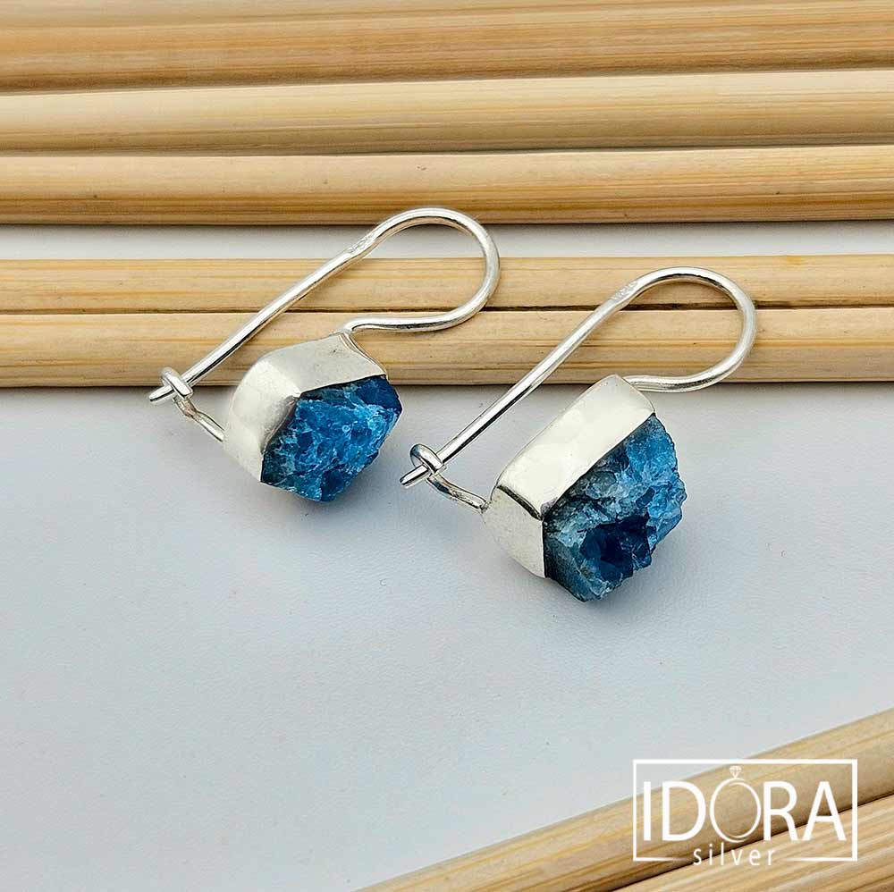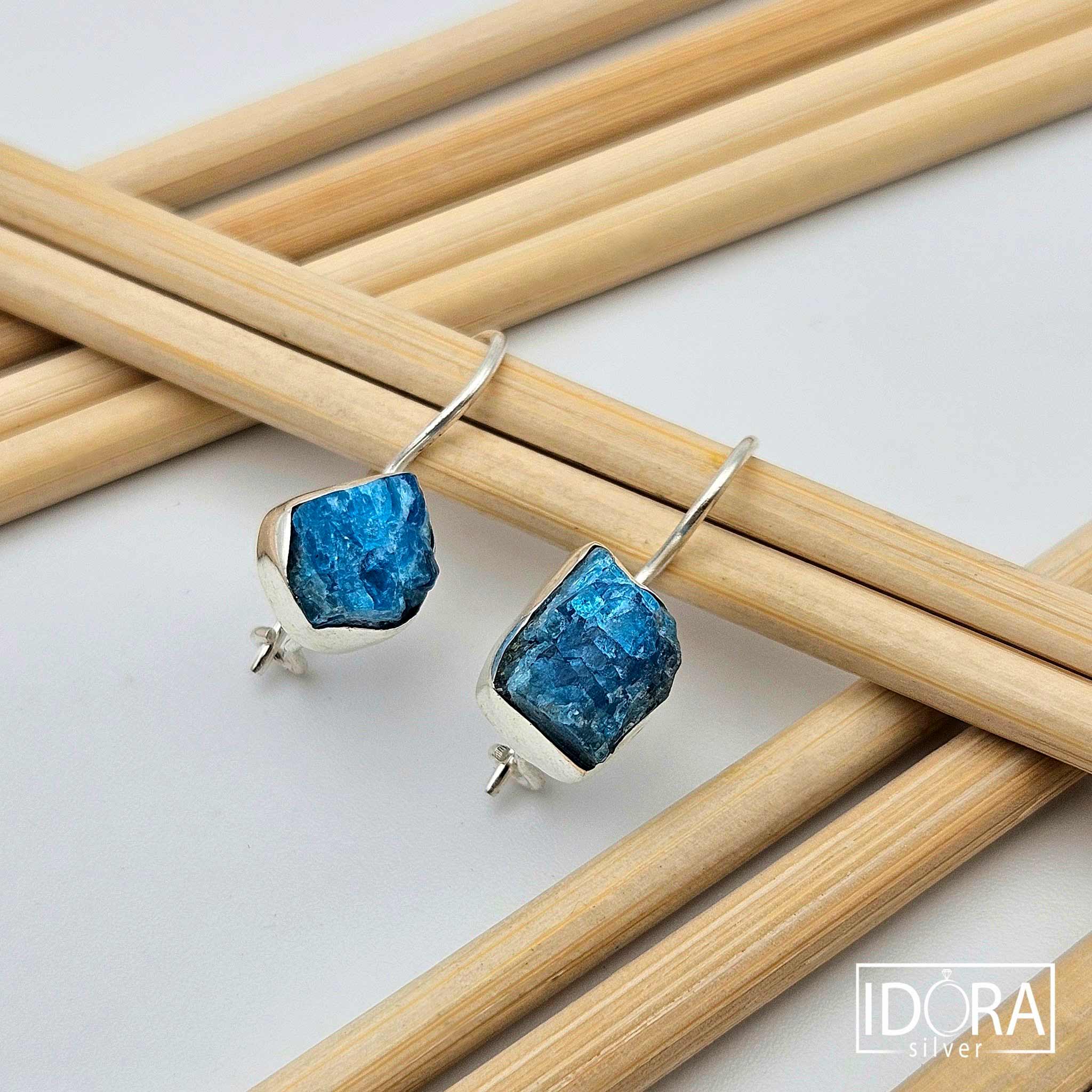 АПАТИТ в суровата си красота и неподправен чар – дълбокият син цвят на необработените камъни носи мистерията на океанските дълбини, където светлината докосва водата и създава блясък от тайни. Сребърният обков обгръща камъните с изчистена елегантност, подчертавайки контраста между суровата естественост и изисканото изкуство на майсторската изработка. Обеците носят усещане за свобода, сила и нежност – перфектен акцент за всеки, умеещ да съчетава неподправеното с изисканото.
