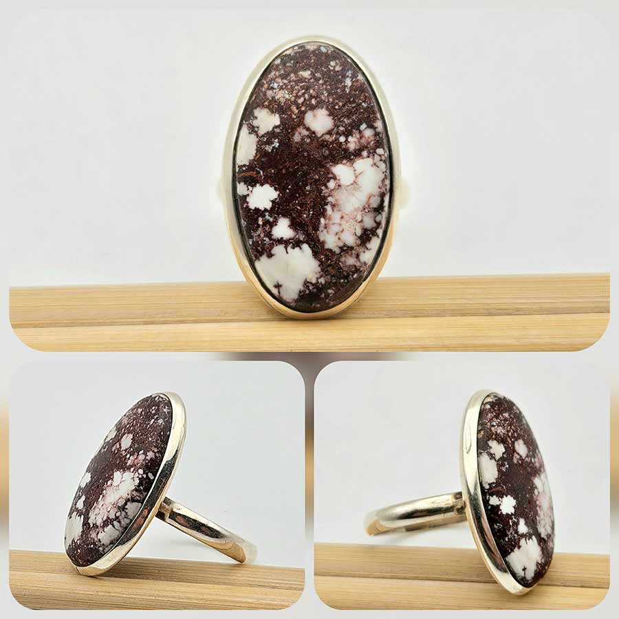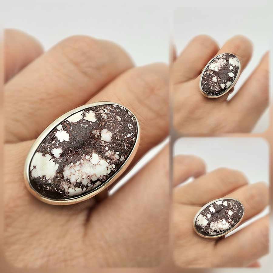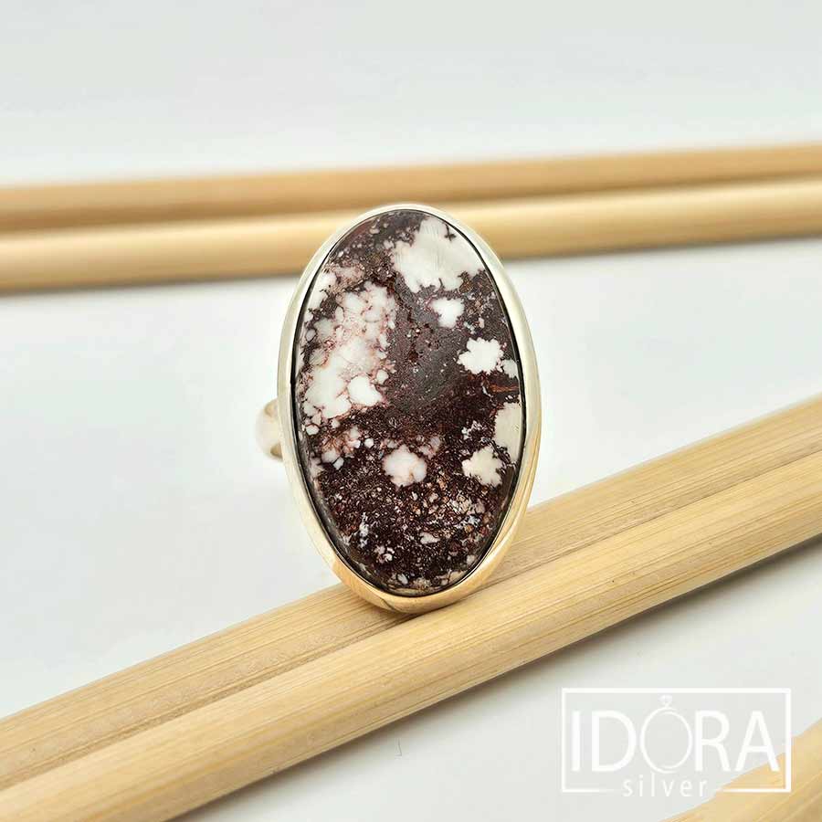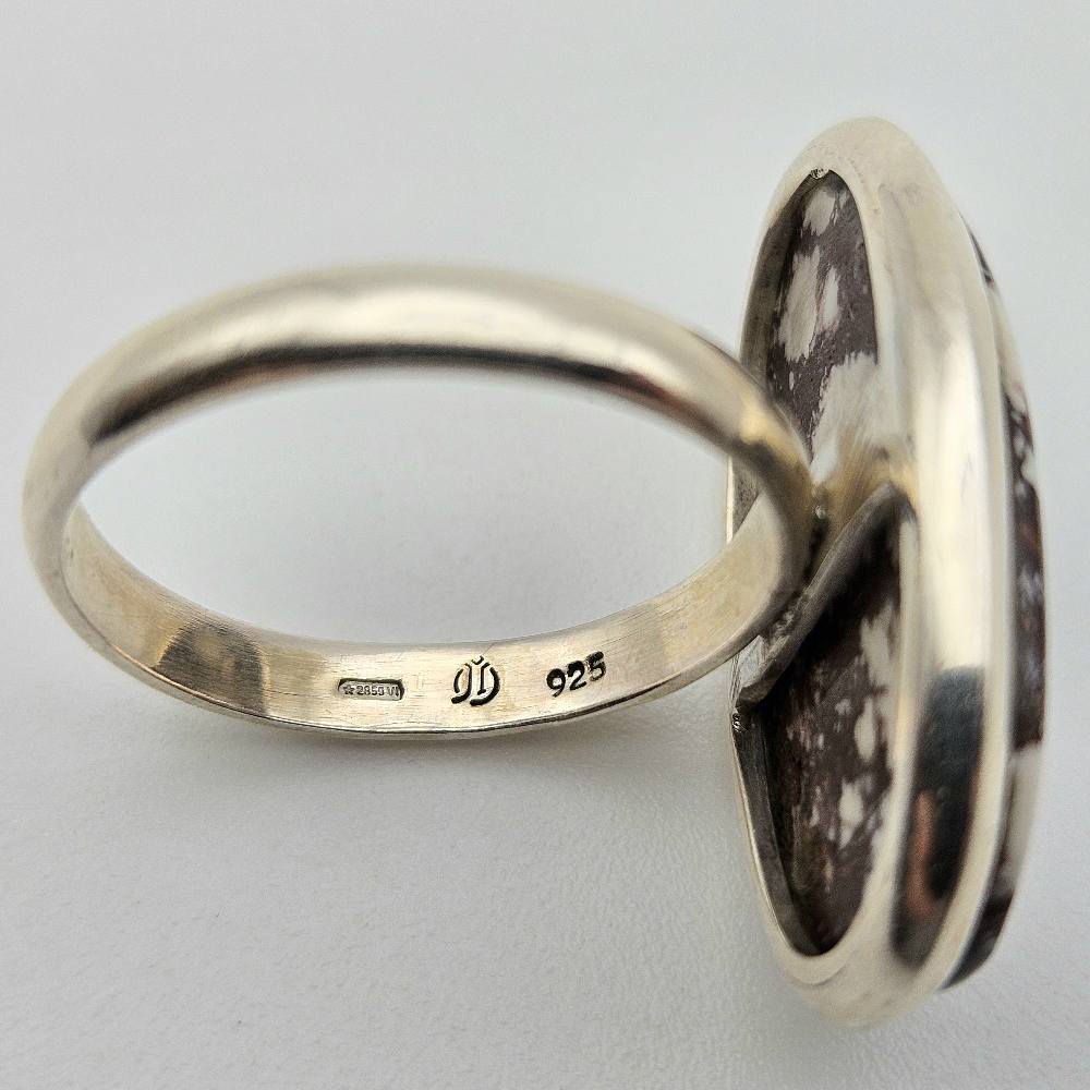КОНСКИ ЯСПИС в дълбоки кафяви тонове, преливащи в кремави и снежнобели петна, в драматичен контраст, напомнящ експлозия в миниатюрна галактика, прегърната от сребърна рамка, нежно подчертаваща естествената му текстура и придавайки усещане за елегантна завършеност – комбинация от сурова природна енергия и изтънчен минимализъм.