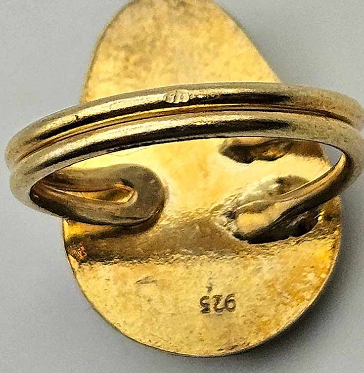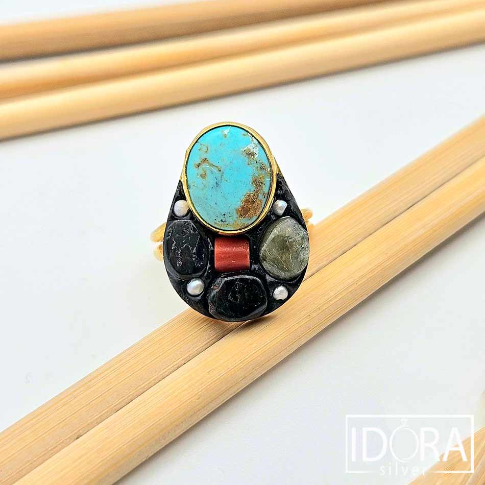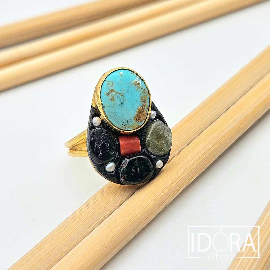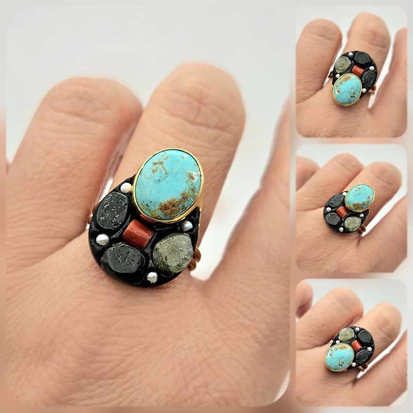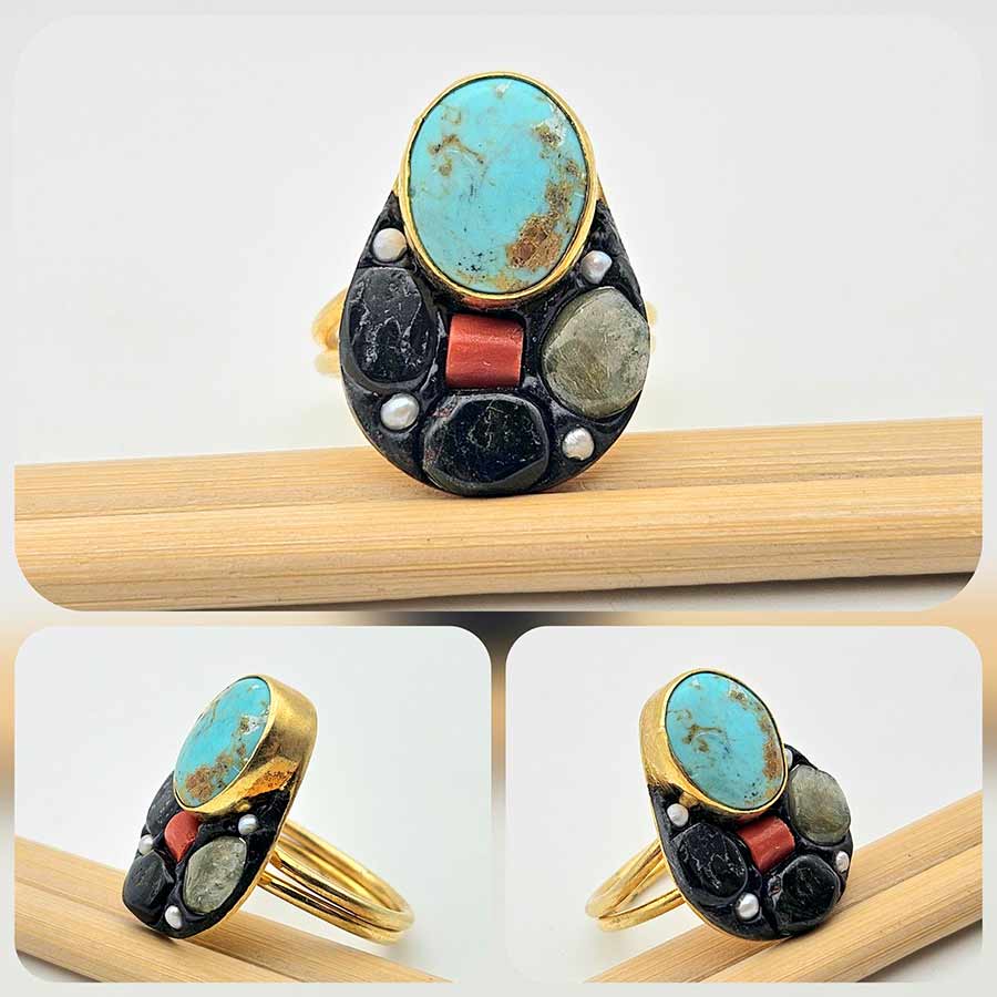 Пръстен, излъчващ духа на древни земи и скрити съкровища – централен овален ТЮРКОАЗ с естествени златисто-кафяви нюанси, червен КОРАЛ, парченце РУТИЛ (Косите на Венера) в синхрон с ЧЕРЕН ОНИКС, ТУРМАЛИН и миниатюрни фини ПЕРЛИ. Впечатляваща композиция в малка вселена от цветове, влияние и текстури с уникален характер, силно подчертан от лукса на позлатата.