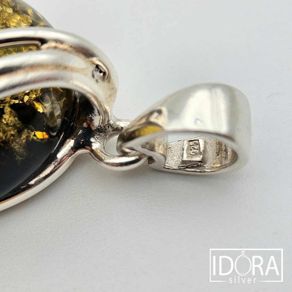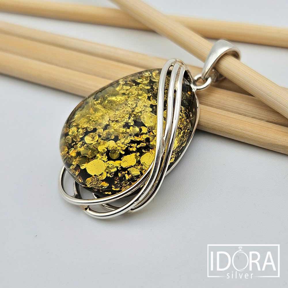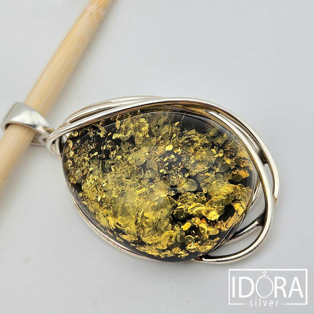 ЗЕЛЕН КЕХЛИБАР и изкуство срещнати в съвършена хармония. Осеян със златисти включения, напомнящи на капчици слънчева светлина застинали във времето, с усещане за движение и живот, бушуващ в миниатюрна вселена – кехлибарът е елегантно обгърнат от фино изваян сребърен обков, танцуващ около него като вълна.