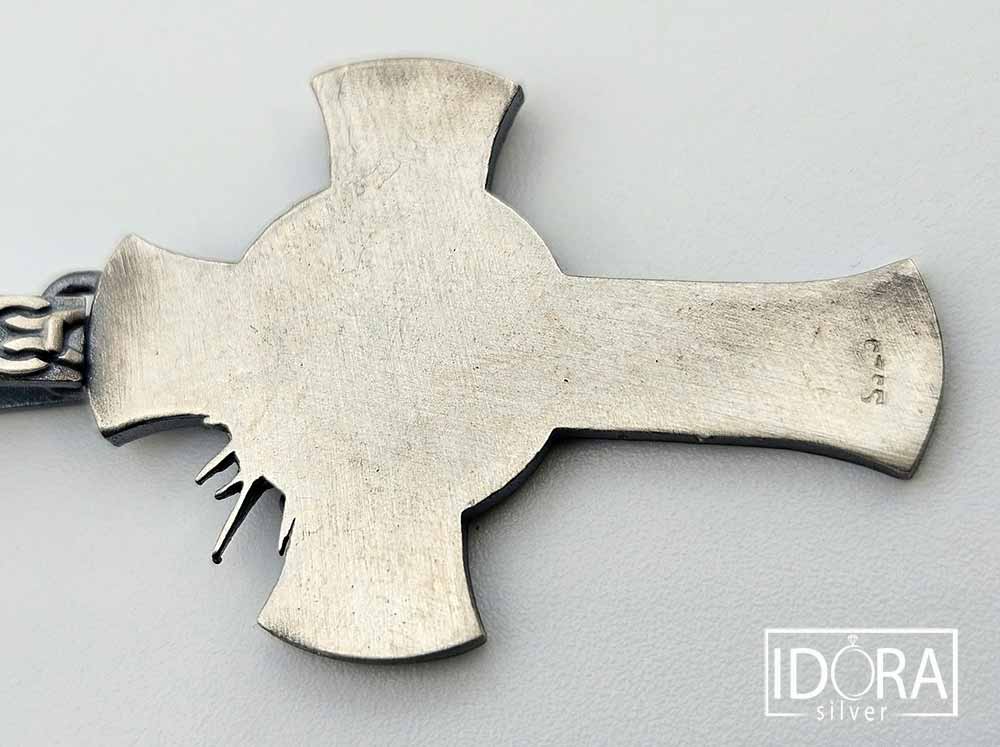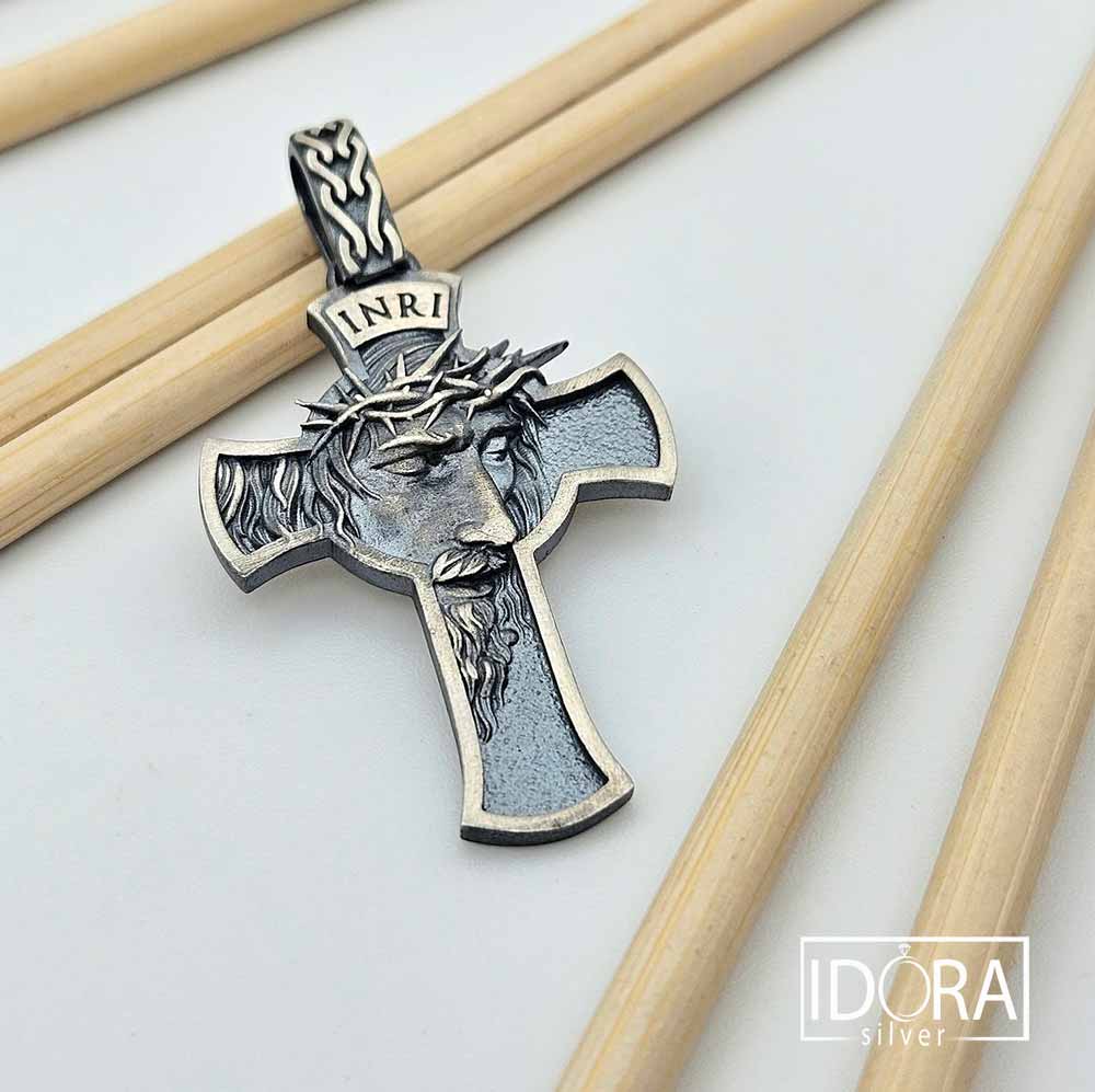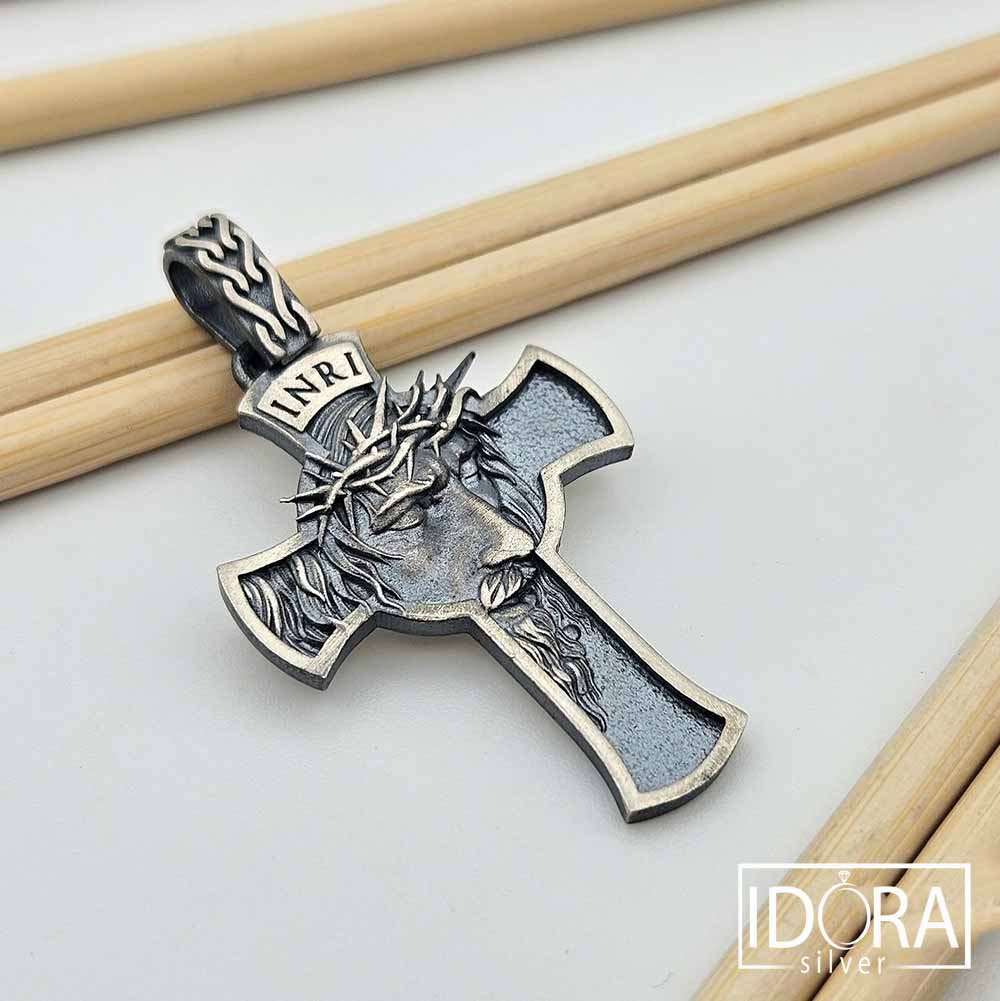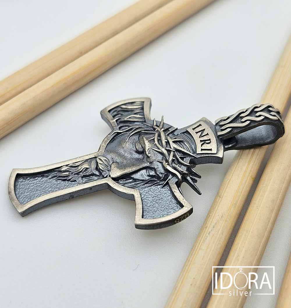 Артистична и емоционално наситена композиция в масивен оксидиран кръст, прецизно изработен със забележителна детайлност в изображението. Латинската фраза Iesus Nazarenus Rex Iudaeorum (Иисус Назарянин, Цар Юдейски)е поставена на кръста, напомняйки символика от векове. Кръстът е с разчупена форма от широки, разширяващи се краища, придаващи му мощ и мекота в силуета.