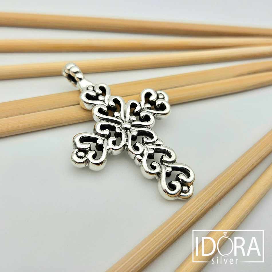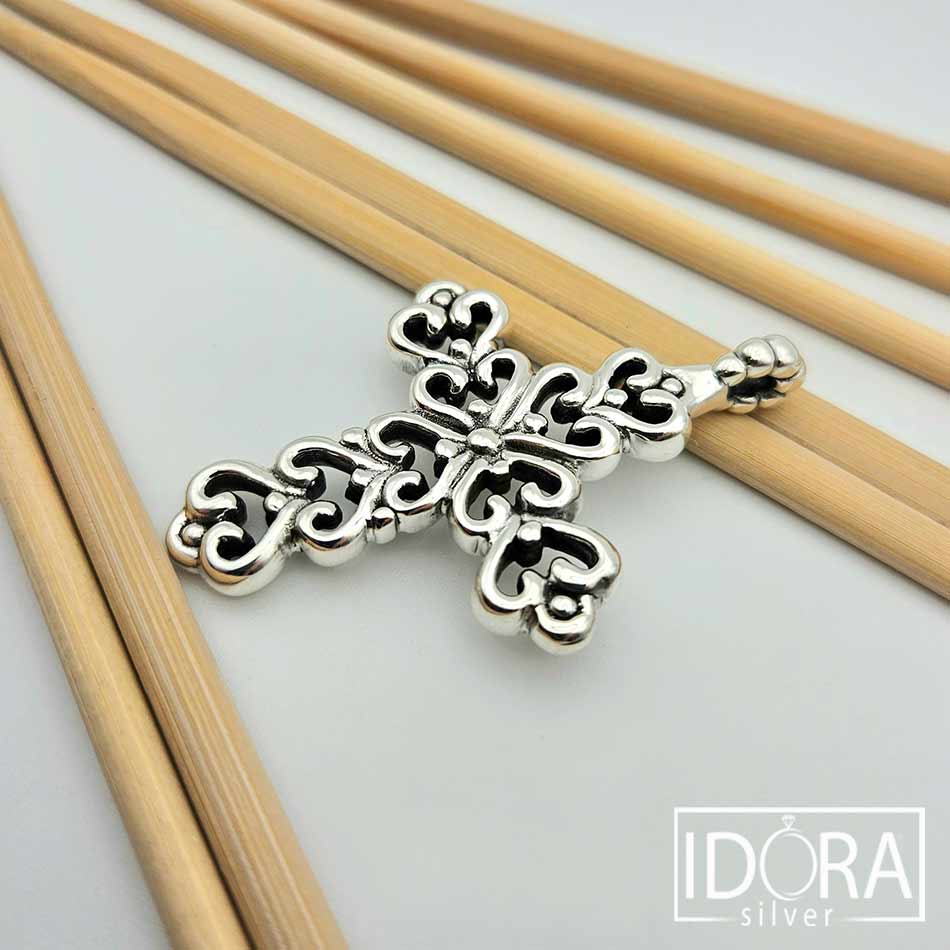 Сребърен кръст, изработен в изразителен дизайн с елегантни извивки и фино оформени детайли, напомнящи бароков стил. Богатата орнаментика придава дълбочина и впечатляващ визуален ефект, превръщайки символа на вярата в силно естетично и духовно присъствие.