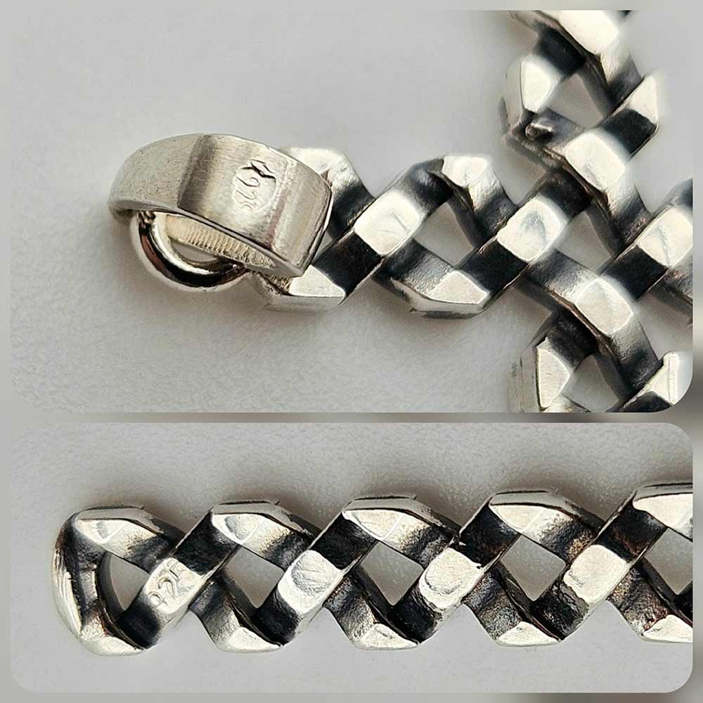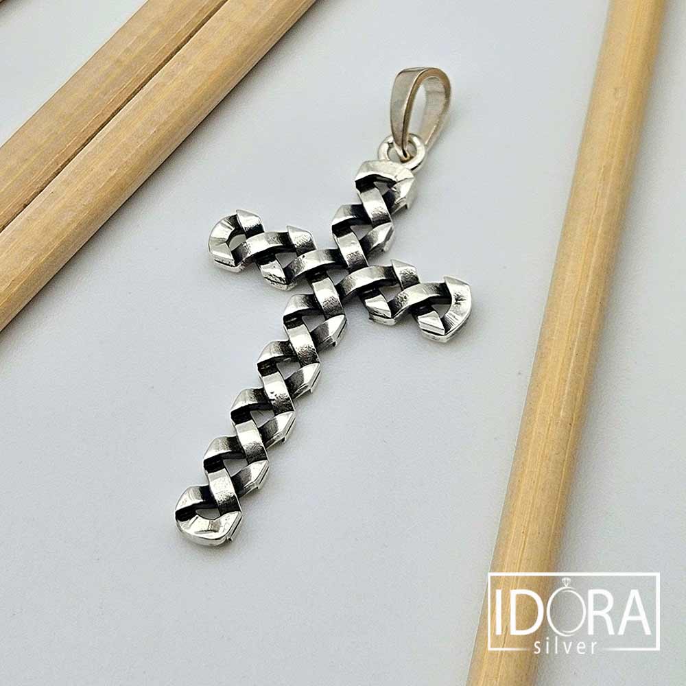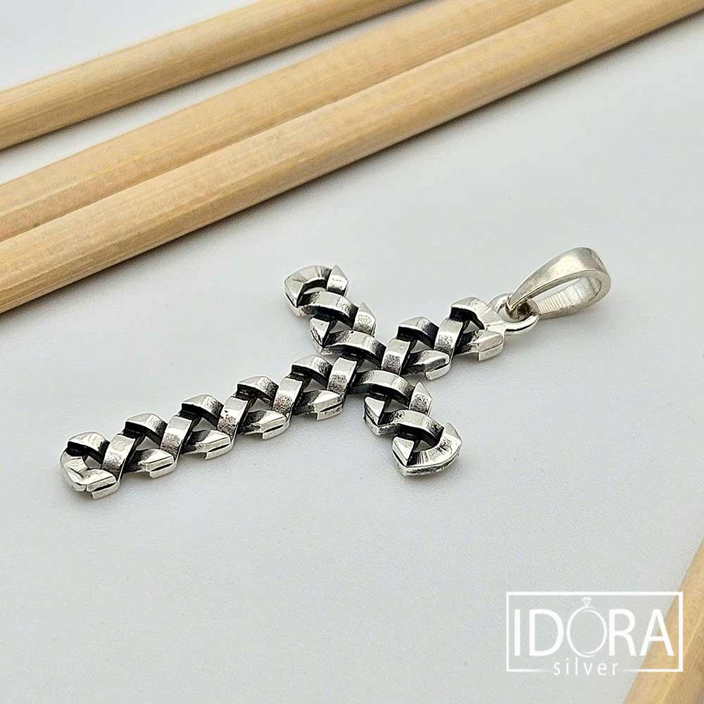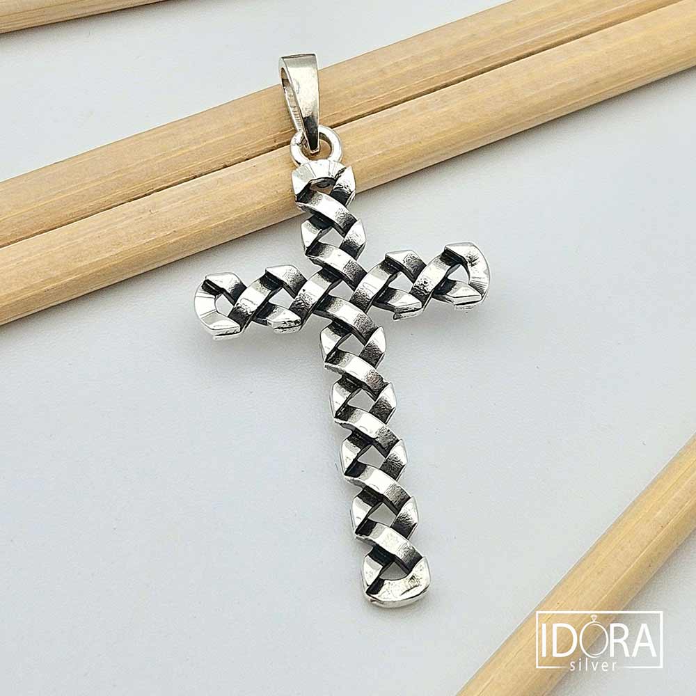 Сребърен медальон, изграден от плътни елементи, които вплитат вяра, сила и изящество в изваяна форма на кръст. Дизайнът носи усещане за древност и символика, а в същото време излъчва модерен почерк, съчетавайки архаизъм и съвременно изкуство в едно изключително бижу.