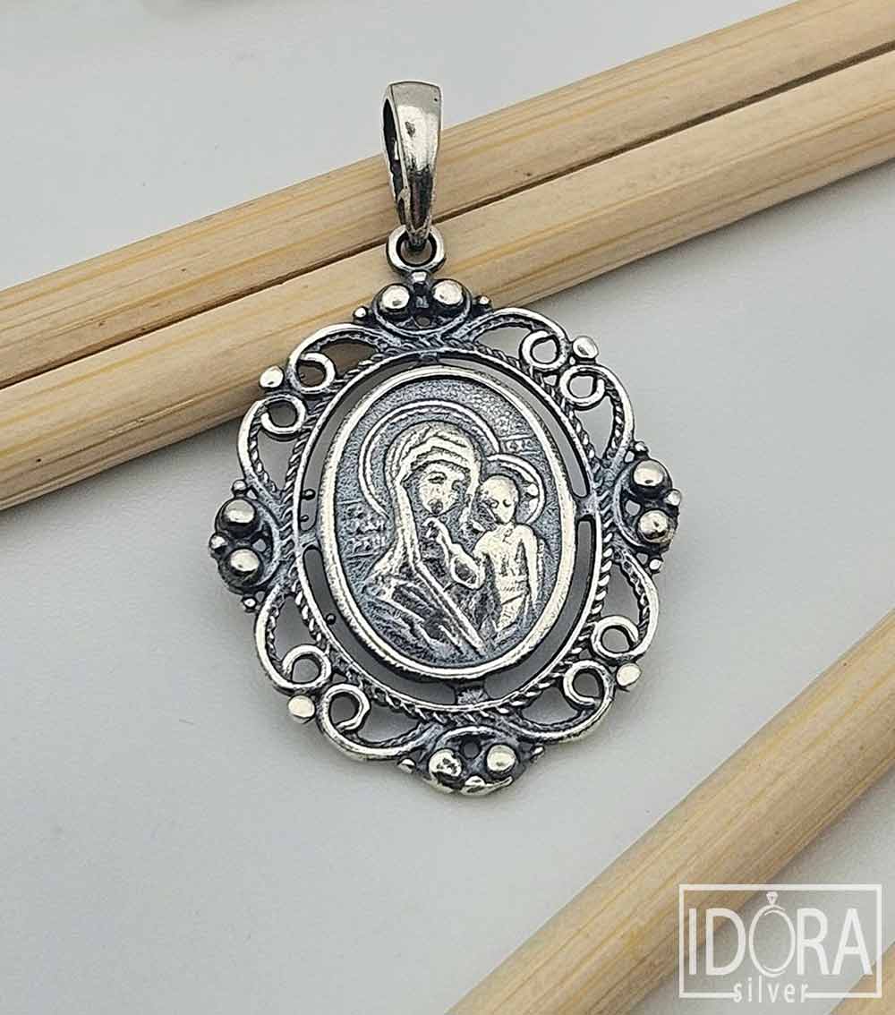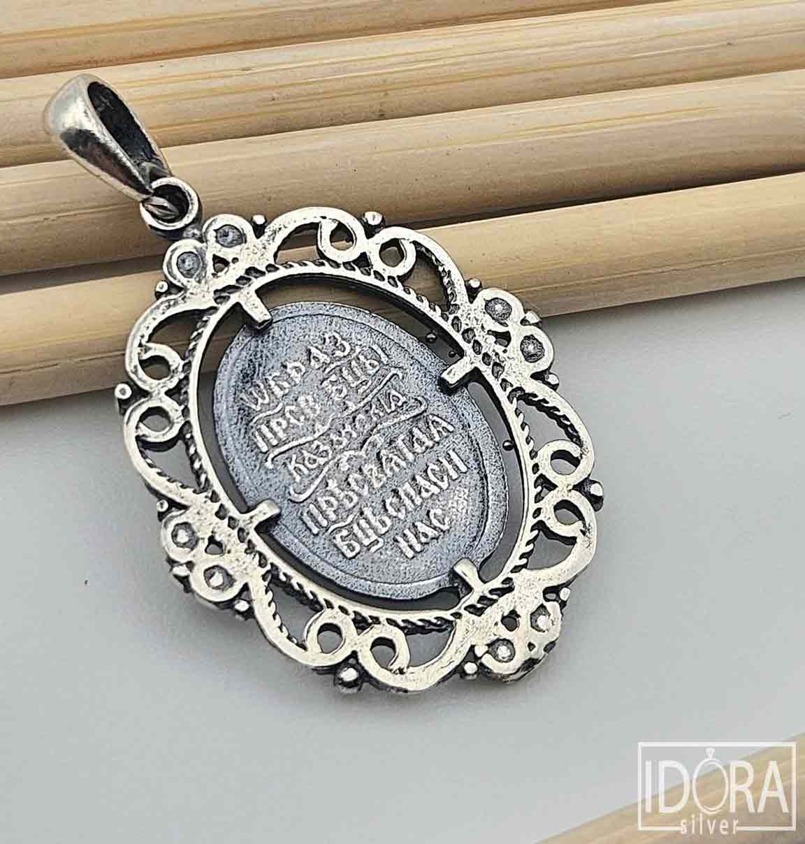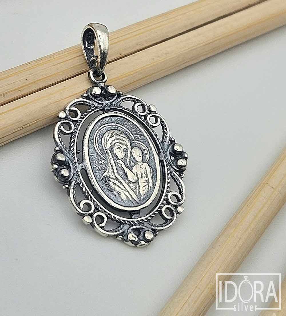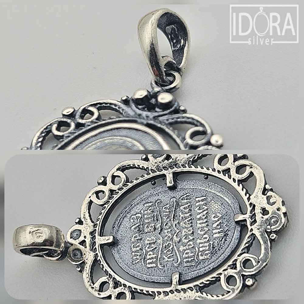 Малка сребърна икона, обрамчена в изящна орнаментирана рамка с витиевидни елементи и релефни топчета, които придават изискан и старинен облик. Патинираното сребро деликатно подчертава фините детайли на гравюрата, придавайки ѝ античен ефект и дълбочина. Този изящен артефакт носи силно духовно значение и излъчва усещане за покой, вяра и свързаност с традицията.