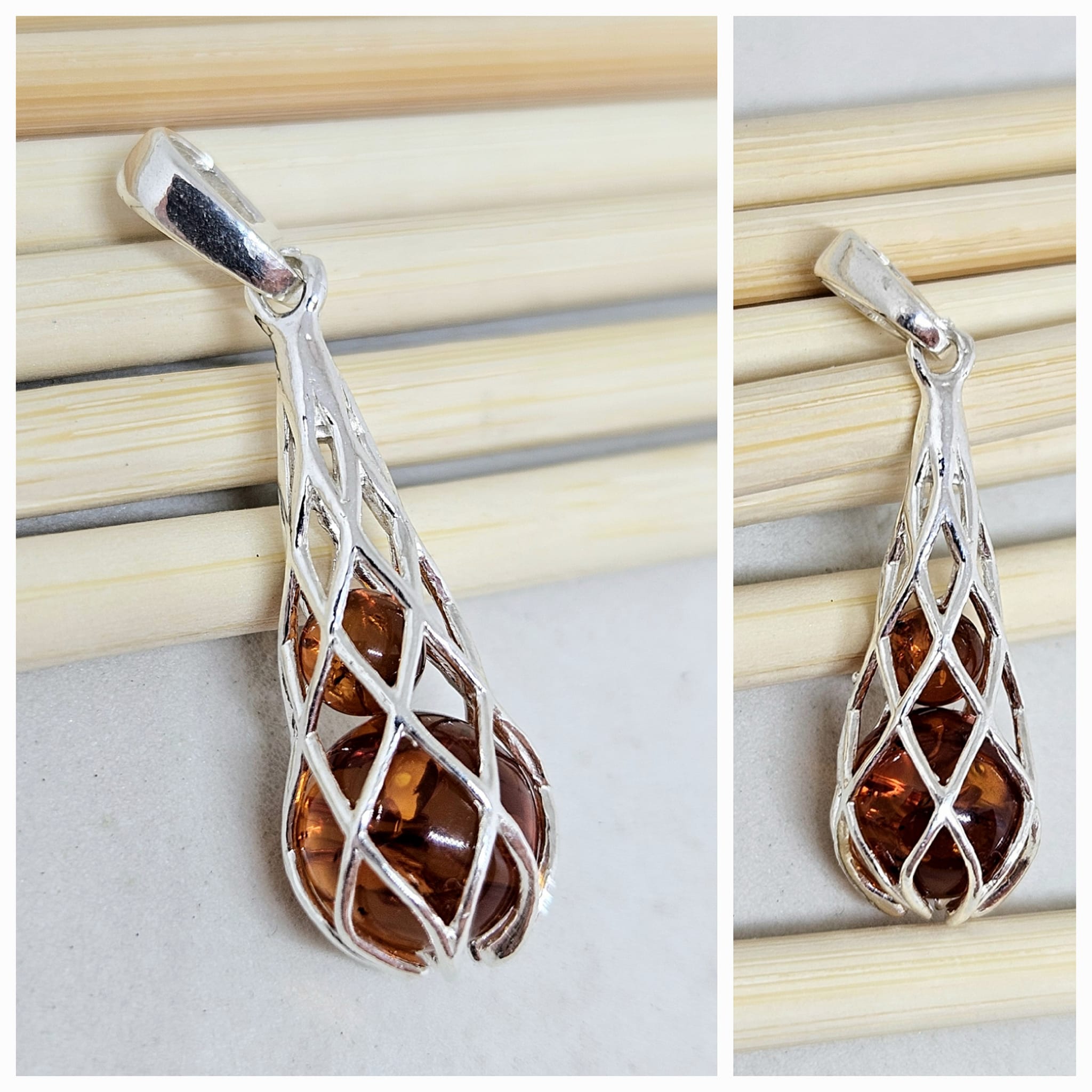 Две Кехлибарени планети, сияещи в топлите си златисти нюанси, са нежно оплетени в мрежа от сребро, която ги свързва в хармонична орбита. В тях сякаш е събрана цялата лечебна сила и енергия на Кехлибара, натрупвана във вековете и съхранила шепота на древни времена. Сребърната обвивка придава изящество и символичност, превръщайки композицията в бижу – едновременно мистично, елегантно и наситено със смисъл.
