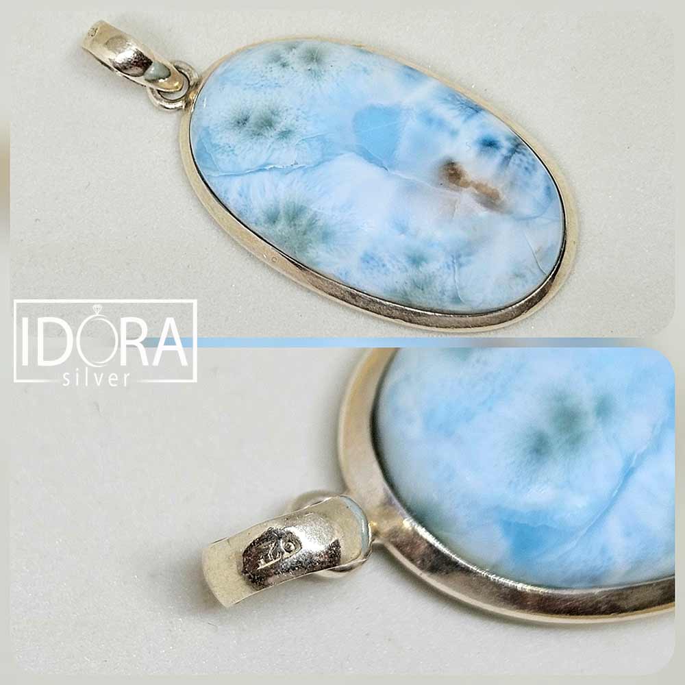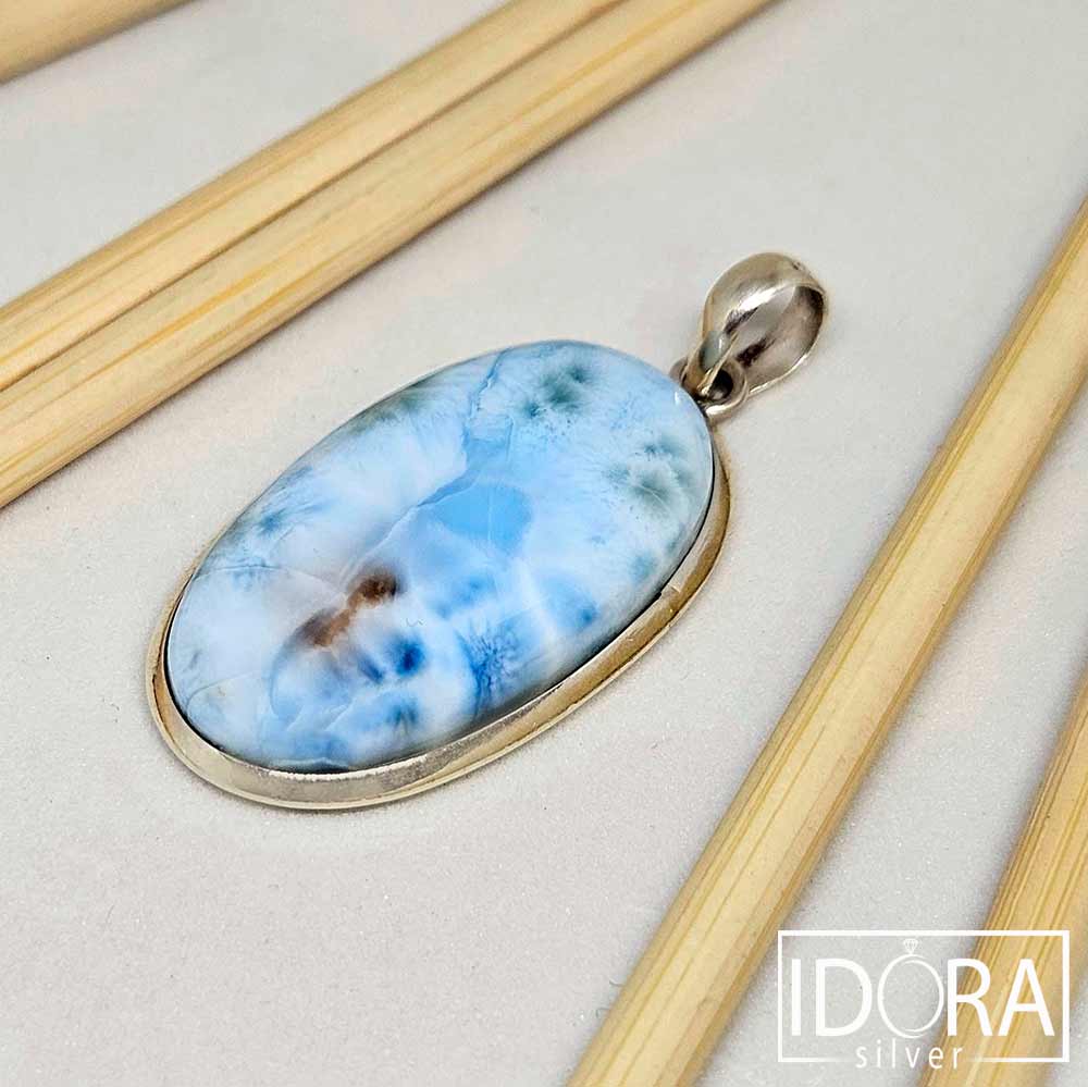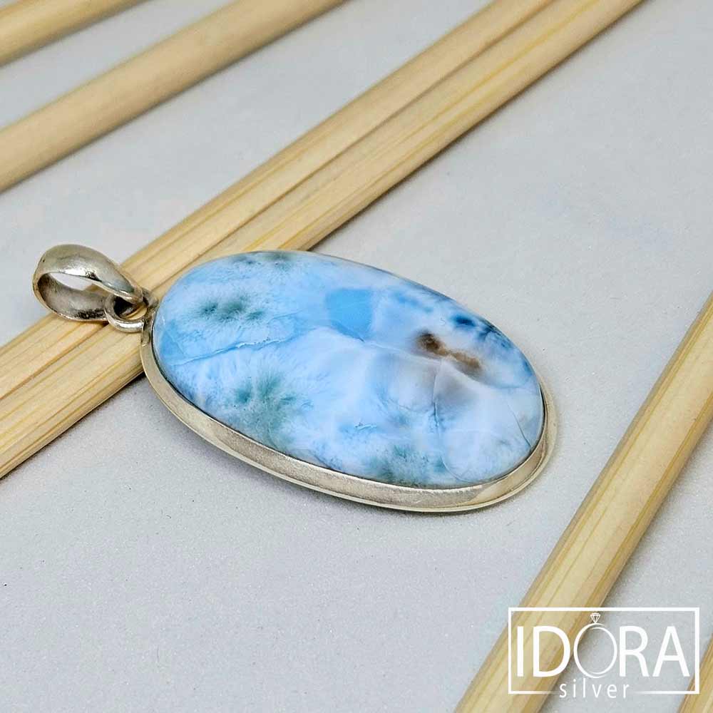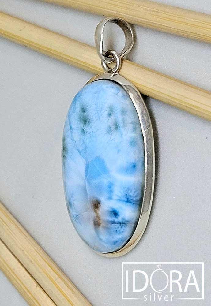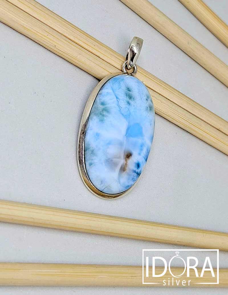 Впечатляващ ЛАРИМАР, разкриващ хипнотизиращи сини цветове, които напомнят на безкрайни небеса и дълбоките води на океана. Семплият сребърен обков нежно подчертава естествената красота на камъка, без да я засенчва, оставяйки я да засияе с пълната си сила. Това е бижу – символ на безкрая, вечността и спокойствието на морето, носещо хармония, мекота и усещане за духовна чистота.