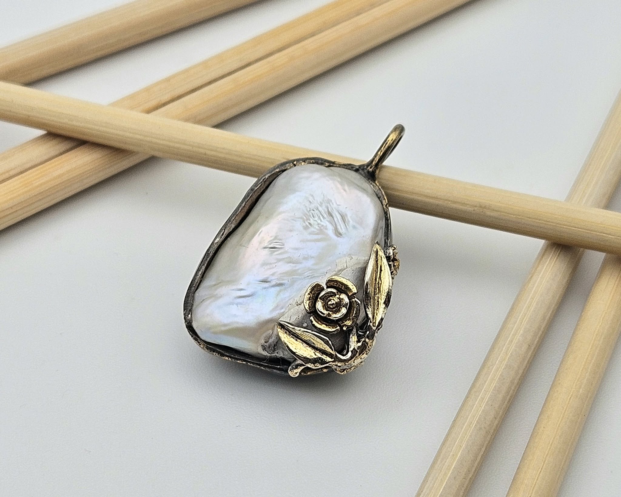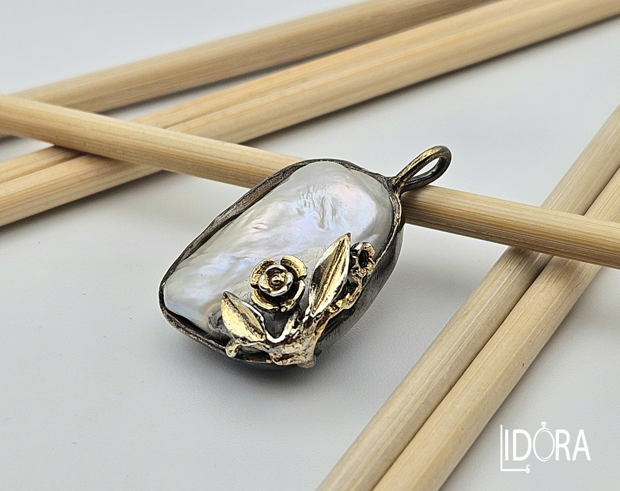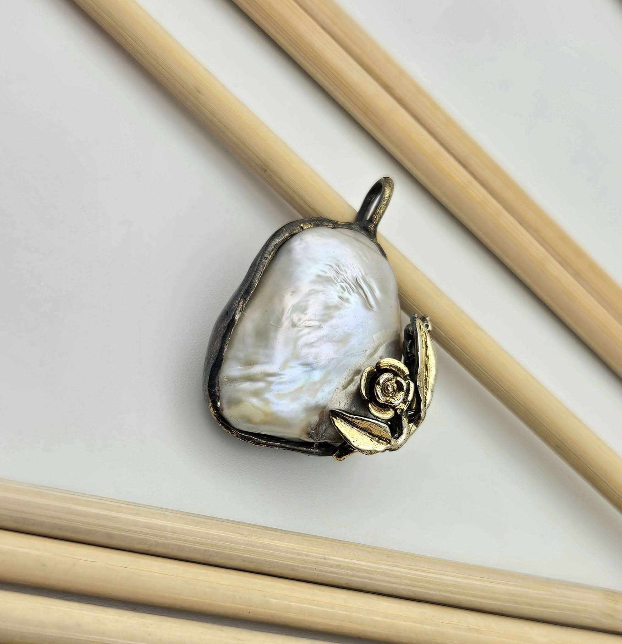 Впечатляваща БАРОКОВА ПЕРЛА – съкровище на природата, превърнато в бижу, изработено с душа и внимание към всеки детайл. Тя носи суровата и неподправена красота на истинската перла, чиито неправилни форми придават характер и уникалност, а всяка извивка отразява светлината по свой неповторим начин. Тази естествена сила е нежно обгърната и стоплена от изящни флорални елементи, които като миниатюрна градина се разгръщат около сърцевината на медальона.