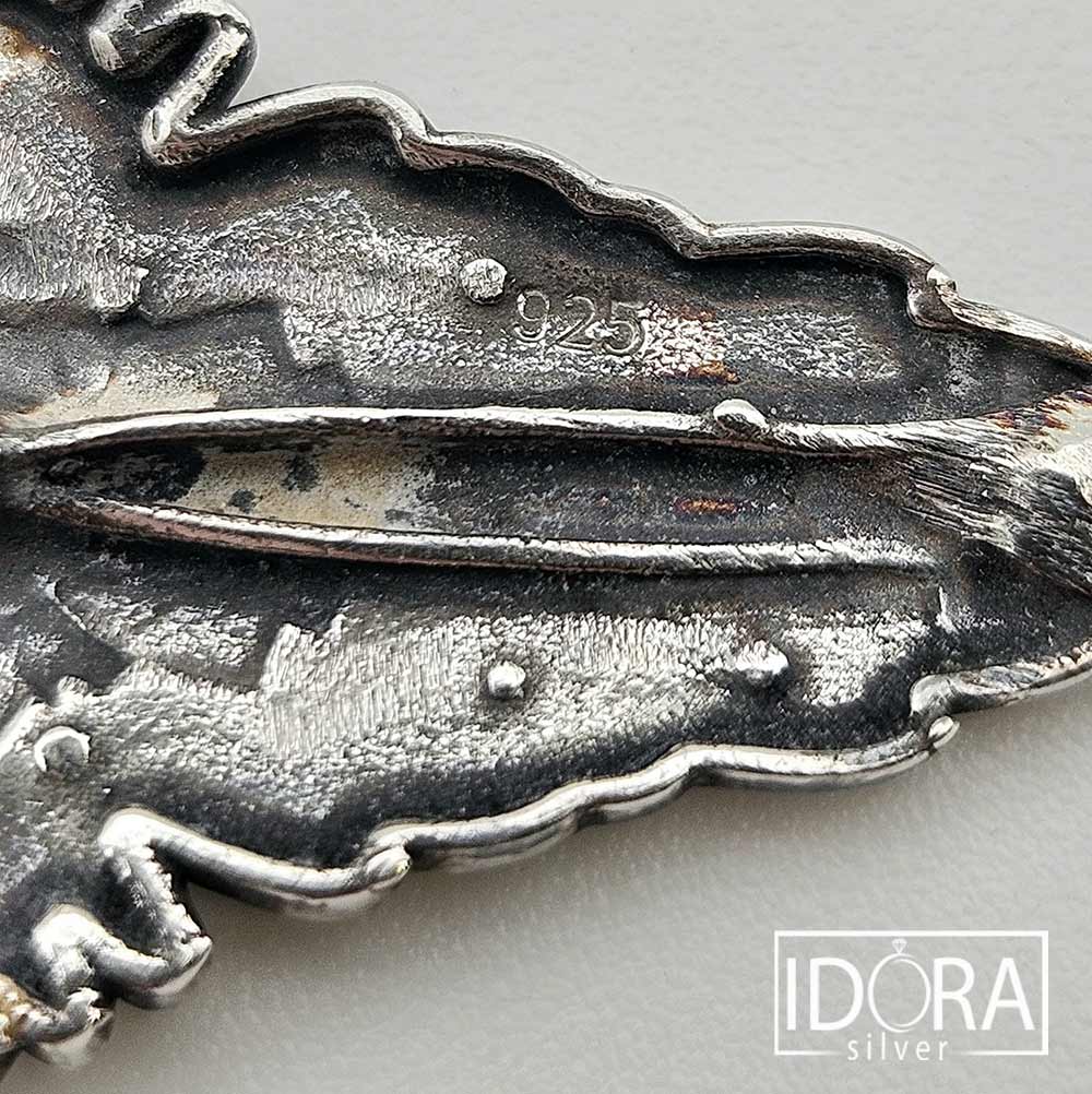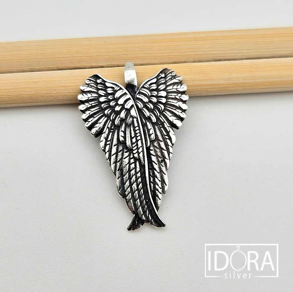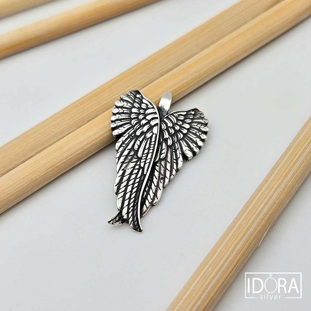 Застинали ангелски криле, прибрани в очакване – всяко перо е щателно изваяно, с дълбоки линии и нюанси на благородна патина, подчертаваща контраста между светлината и сенките. Медальонът е събрал символиката на закрила, свобода и надежда за всеки, мечтаещ да носи със себе си щипка магия.