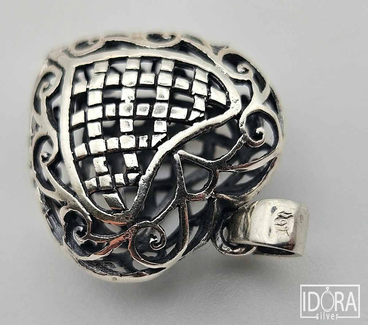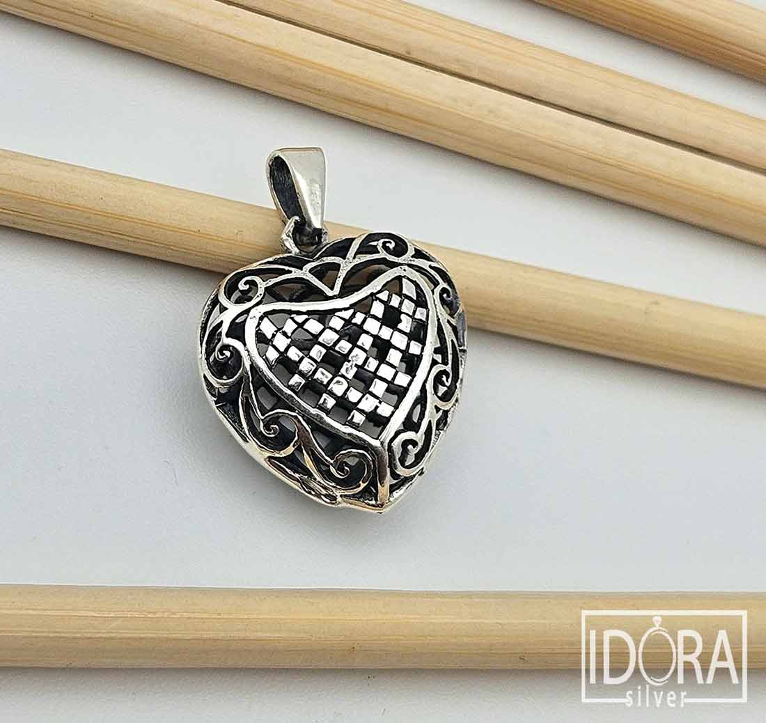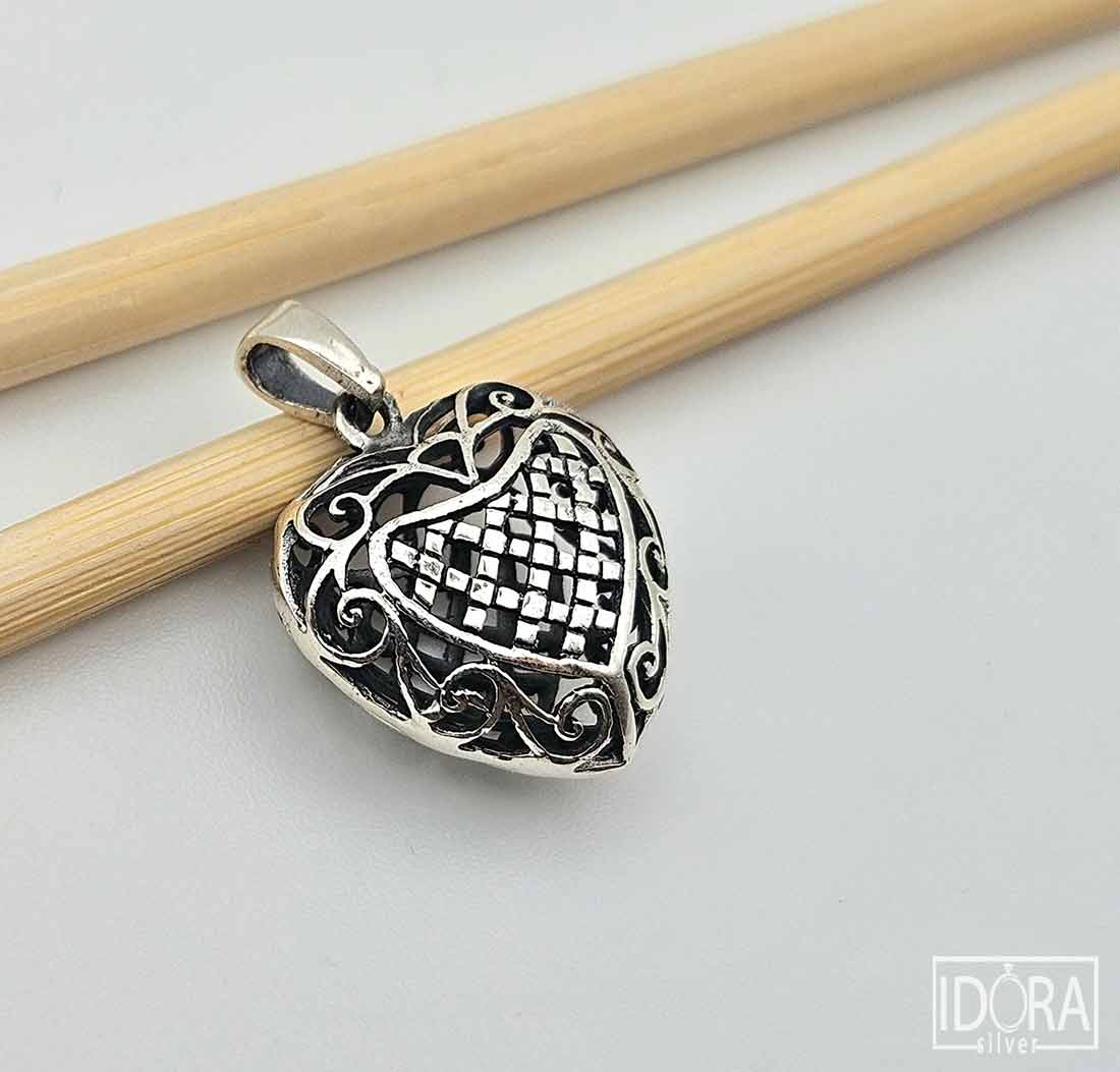 Обемно сребърно сърце, изваяно със стил и изящество, чиито повърхности са прецизно изрисувани с фина орнаментика. Деликатните линии и нежните мотиви придават усещане за лекота и изтънченост, превръщайки класическия символ в изключително елегантен акцент. Съчетанието между силата на метала и мекотата на декоративните детайли създава хармония, която излъчва както романтика, така и неподвластна на времето красота.